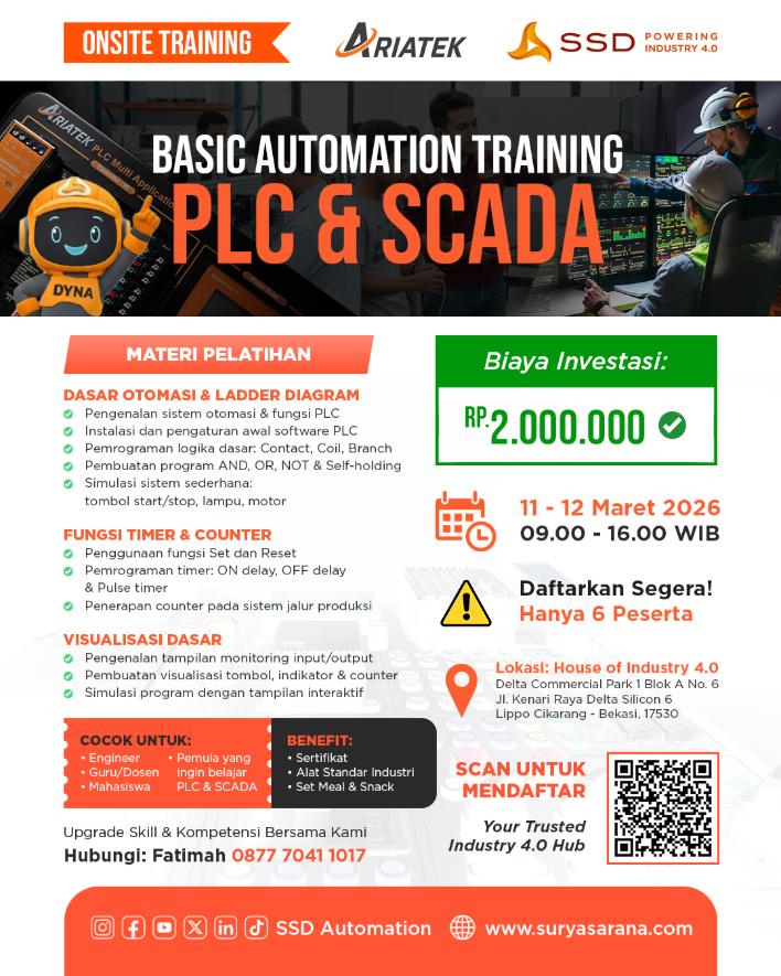 Kami hadirkan Onsite Training: Basic Automation Training PLC & SCADA β€” pelatihan intensif yang dirancang untuk membantu Anda memahami dasar otomasi secara praktis dan aplikatif.