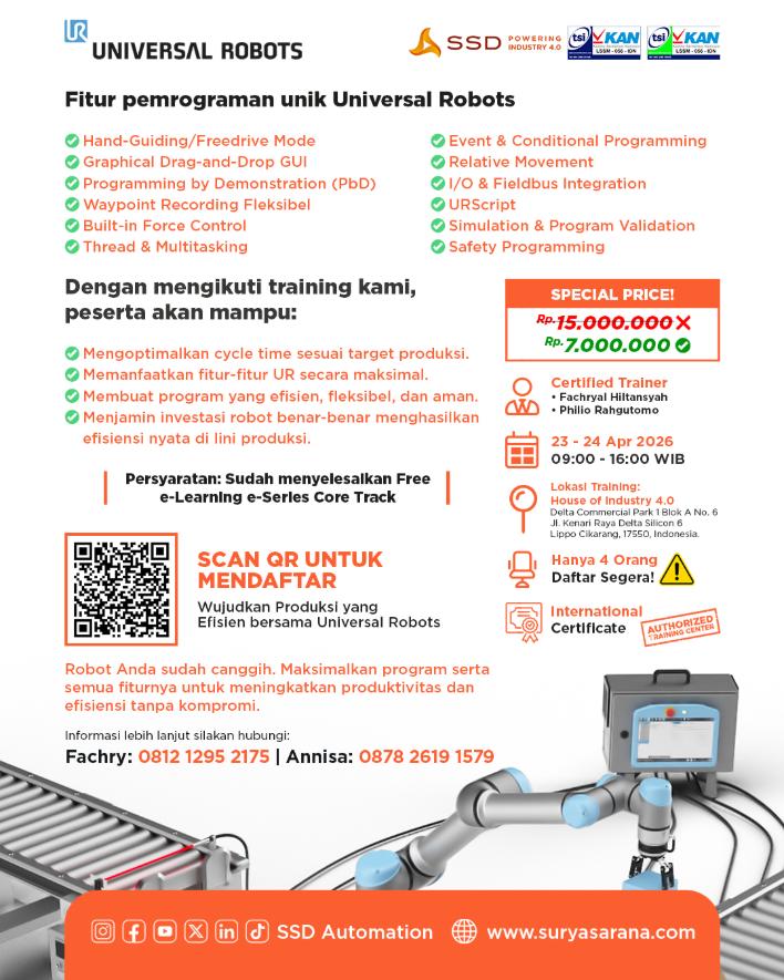 Pelatihan ini dirancang untuk membantu tim Anda mengoptimalkan fungsi UR, meningkatkan efisiensi produksi, dan memastikan investasi robot Anda menghasilkan hasil terbaik.