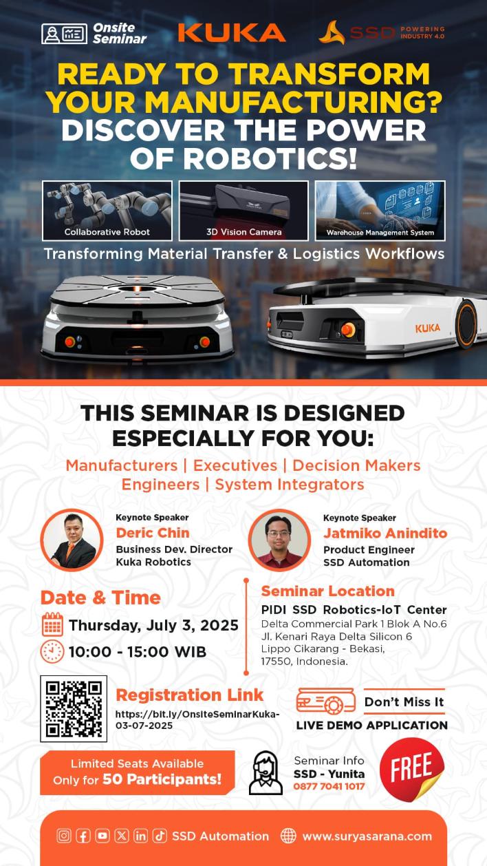 SSD Automation, in collaboration with KUKA, proudly presents an onsite seminar themed “Ready to Transform Your Manufacturing? Discover the Power of Robotics!”